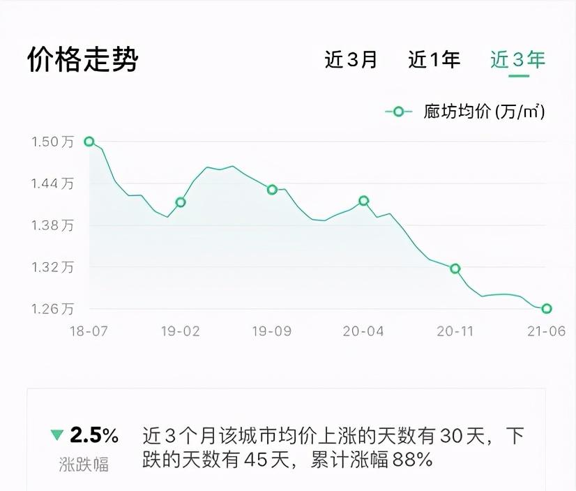 具體的房?jī)r(jià)走勢(shì)圖我沒(méi)有查到,不過(guò)可以看到廊坊的房?jī)r(jià)走勢(shì)圖,自2018年開(kāi)始,仍在一路走低。