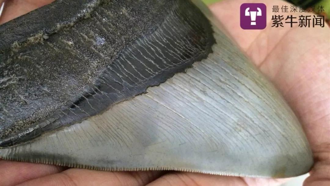 江泓向紫牛新聞記者展示了一顆成年巨齒鯊牙齒的化石,可以看見牙齒化石呈現灰藍色,還有黛色和奶油色的牙釉質,邊緣有很多密集的鋸齒結構,可以幫助巨齒鯊在捕獵時切斷鯨肉,并且巨齒鯊的攻擊力極強,水下運動速度迅猛,因而被稱為海洋中的強生物。