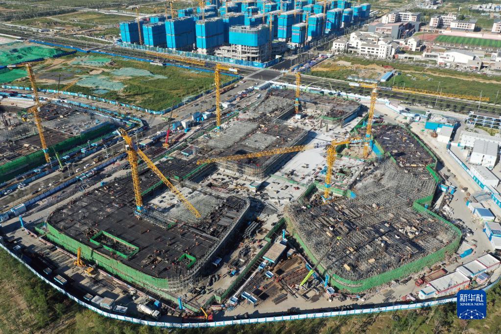2022年9月7日拍攝的位于雄安新區(qū)啟動(dòng)區(qū)的中國星網(wǎng)雄安新區(qū)總部大樓建設(shè)施工現(xiàn)場(無人機(jī)照片)。