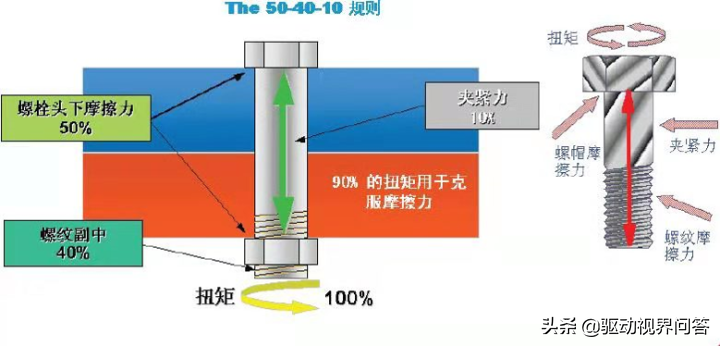 差速器螺栓的擰緊是為了用螺栓的夾緊力將主減齒輪壓緊在差速器殼體上,使其可以克服主減齒輪旋轉(zhuǎn)的靜摩擦力和工作載荷下的軸向力。在滿足使用要求的前提下,還要防止施加的扭矩超過螺栓的抗拉強度極限而造成螺栓斷裂和內(nèi)螺紋脫扣的失。需要注意的是,施加的扭矩T與實際起作用的夾緊力F之間的關(guān)系并不等同。