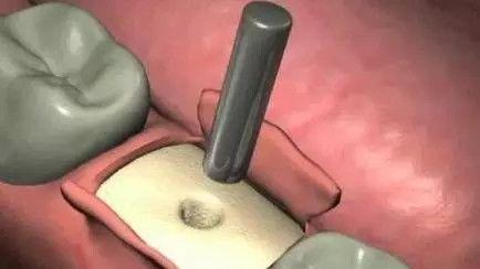 2、正式開始種植牙手術(shù)。在牙槽骨上制備一個孔,植入人工種植體。將牙骨床內(nèi)嚴(yán)密縫合,大約一個星期后可以拆線。