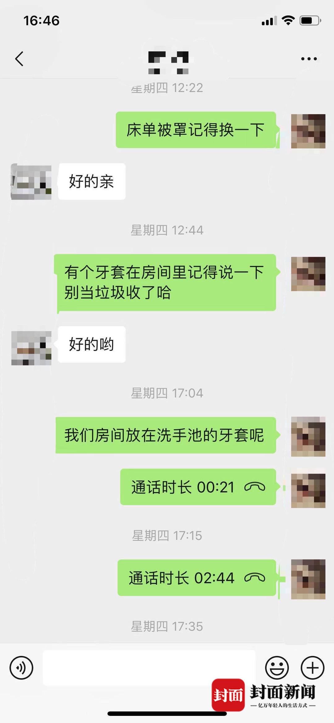 9月4日下午,封面新聞記者在酒店見到了前臺員工和清潔員。據前臺員工介紹,當天她的確收到了客人發(fā)送的注意牙套的消息,也向清潔員轉達了該信息。