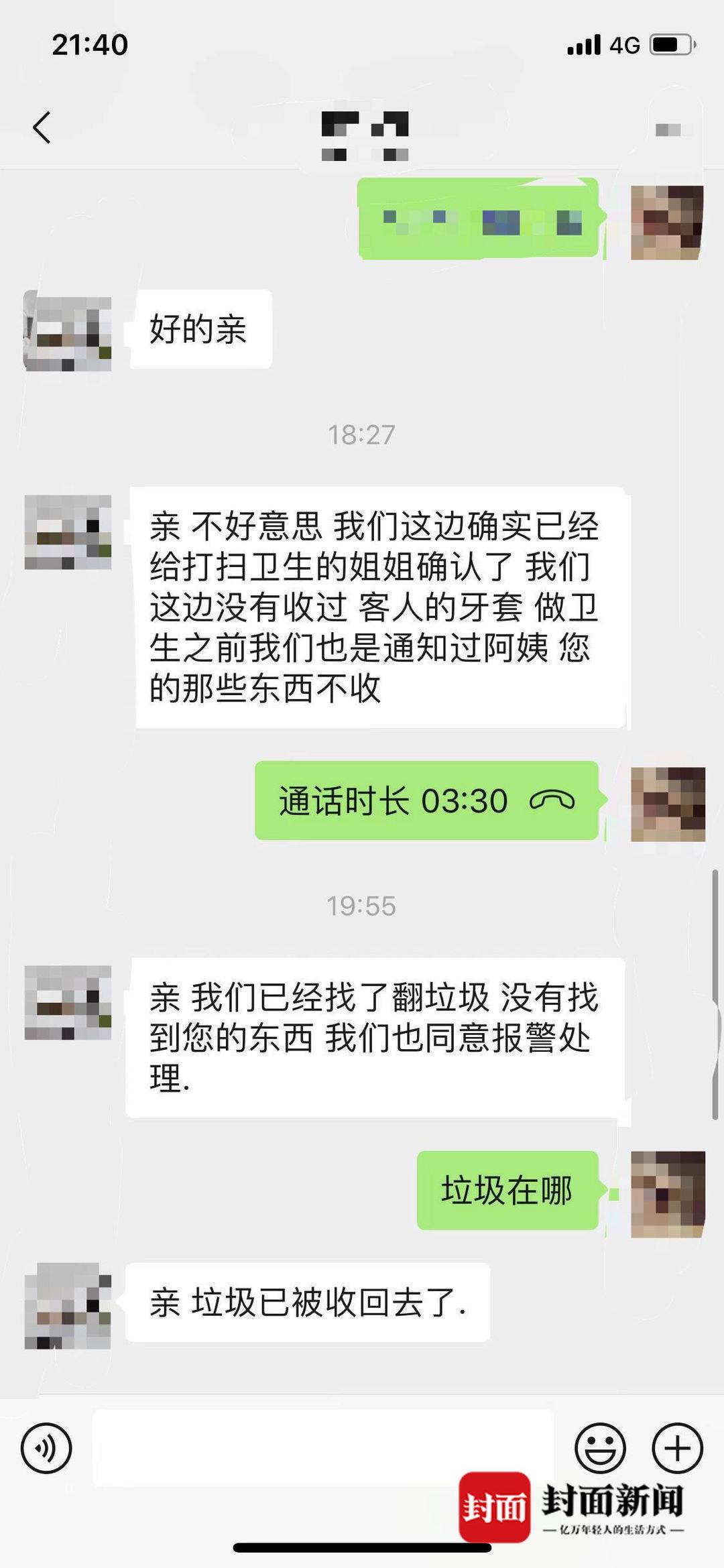 下午5點,張婷與家人回到酒店房間后,發(fā)現(xiàn)牙套不見了?!爱敿次揖徒o前臺發(fā)消息詢問,前臺說幫我們找一下。隨后又說物業(yè)把垃圾運走了,找不到了,并稱清潔員在打掃過程中并沒有見到牙套?!?/p>