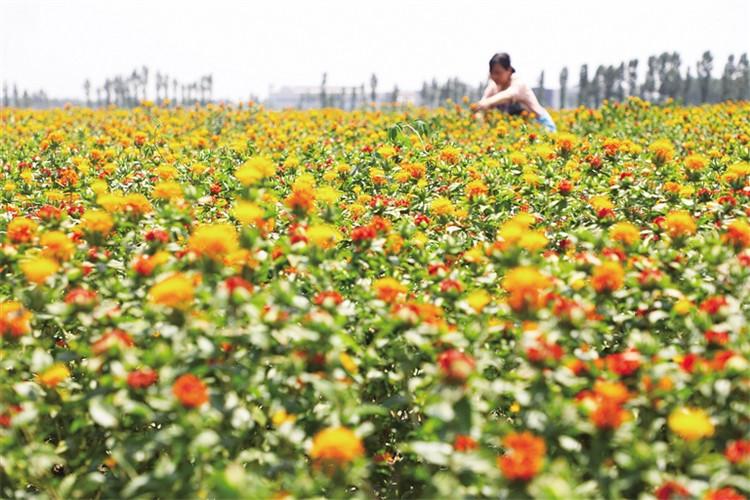 6月21日,河北省唐山市豐潤區(qū)小張各莊鎮(zhèn)南坨村農(nóng)民在管護中藥材紅花。