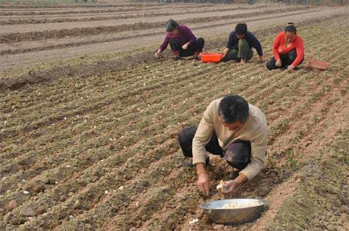 ④春季播種大蒜,由于地溫比較低,大約需要15天萌芽出土。出苗前好不澆水,如土壤干旱影響出苗,可酌情澆一小水,然后鋤劃以利發(fā)根出苗。