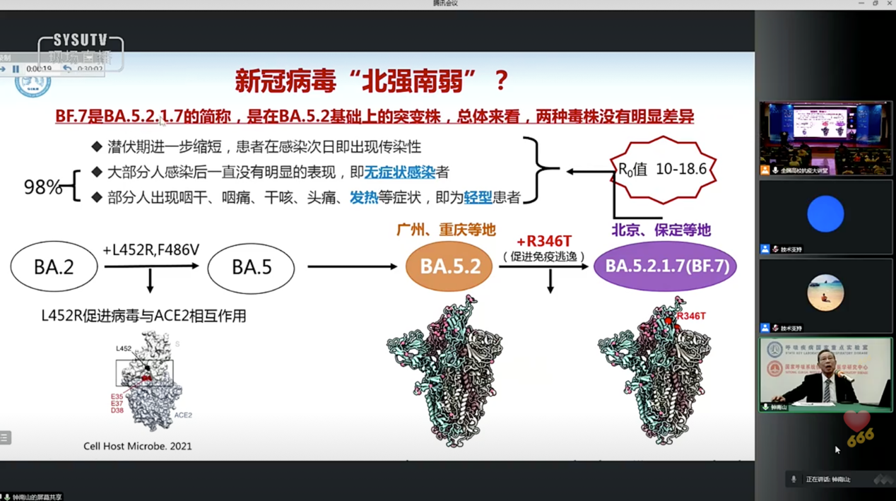 值得注意的是,由于截稿時間限制,該文并未涉及Omicron變異株BF.7亞型。12月15日下午,中國工程院院士鐘南山在“全國高校抗疫大講堂”上作“新冠(Omicron)疫情動態(tài)及應(yīng)對”主題分享時表示,當(dāng)前,北京、保定等地流行的主要為奧密克戎變異株BF.7,廣州、重慶等地主要流行的為奧密克戎變異株BA.5.2。而BF.7是BA.5.2.1.7的簡稱,是在BA.5.2基礎(chǔ)上的突變株,總體來看,兩種毒株沒有的差異。