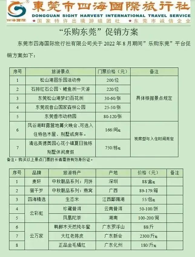 旅行社:四海國際旅行社、廣東臻品悅旅行社、深圳海外國旅東莞分公司、南方之旅、東莞康輝國際旅行社、天安國際旅游、山水國際旅行社有限責任公司、東莞悅行旅行社、廣東樂游旅行社、中國國旅(廣東東莞)旅行社、晨華旅行社、廣東粵青游國際旅行社、運通國際旅行社、宏途旅行社、和興旅行社、港之旅國際旅行社(廣東)、幸福假期旅行社、中青國際旅行社(廣東)、暢途國際旅行社、灣區(qū)自然學校、廣東中青觀光國際旅行社、廣東悅中旅游東莞東城明怡苑營業(yè)部、東莞厚街駿航悅中旅游、廣東東旅國際旅行社、康飛國際旅行社、中之旅(廣東)國際旅行社、途樂旅游、勝景游國際旅行社、東莞眾信旅行社、豐行國際旅行社、廣東周游天下國際旅行社、東莞知行國際旅行社、萬泰旅行社、廣東省中國青年旅行社東莞分公司、中青國際旅行社(廣東)東莞石龍營業(yè)部、逸游天下旅行社、東青游人民公園旗艦店、東青游體育館旗艦店、東青游、東之游國際旅行社