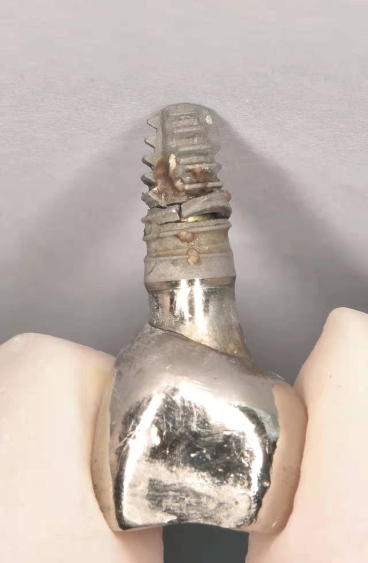 這是我在醫(yī)生交流網(wǎng)上找的一張圖,很,種植體已經(jīng)壞掉了,被取出來了。