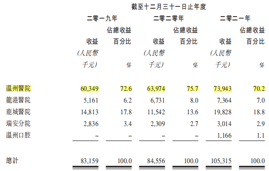 截至目前,中國口腔醫(yī)療擁有及運(yùn)營5家位于溫州的民營牙科醫(yī)院,分別為溫州醫(yī)院、鹿城醫(yī)院、溫州口腔、瑞安分院、龍港醫(yī)院。其中溫州醫(yī)院2019-2021年(以下簡稱“報告期”)的收益分別為6034.9萬元、6397.4萬元、7394.3萬元,占營業(yè)收入的比例分別為72.6%、75.7%、70.2%;龍港醫(yī)院報告期內(nèi)的營業(yè)收入分別為516.1萬元、673.1萬元、736.4萬元,分別占比6.2%、8.0%、7.0%;鹿城醫(yī)院的報告期內(nèi)營業(yè)收入分別為1481.3萬元、1154.2萬元、1982.8萬元,分別占比17.8%、13.6%、18.8%;瑞安分院報告期內(nèi)營業(yè)收入分別為283.6萬元、230.9萬元、301.4萬元,分別占比3.4%、2.7%、2.9%;溫州口腔2021年開始運(yùn)營,去年實現(xiàn)收益116.6萬元,占比1.1%。