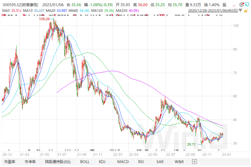 2017年初,A股“眼科茅”歐普康視(證券代碼:300596.SZ)登陸創(chuàng)業(yè)板,在國(guó)產(chǎn)OK鏡龍頭、高達(dá)90%的毛利率的加持下,歐普康視股價(jià)從2.3元一路狂奔至109.26元,高市值達(dá)到880億元。