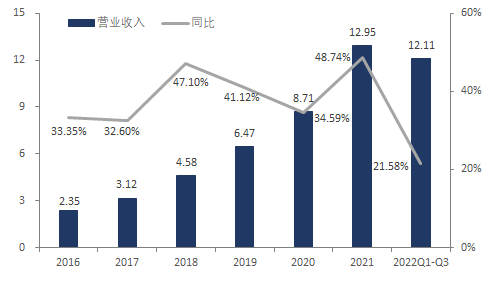 2016-2022Q3歐普康視營(yíng)收及增速情況,單位:億元