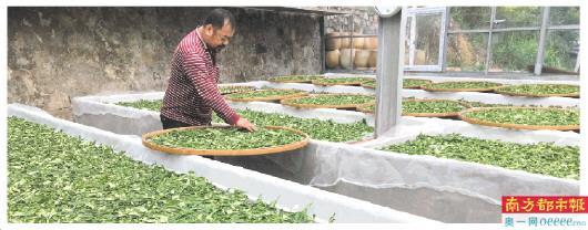 大雨初歇,滿山青翠。茶場(chǎng)主人朋伯帶領(lǐng)南都記者參觀茶場(chǎng)里的茶廠。雖然條件簡(jiǎn)單,但茶廠的設(shè)備一應(yīng)俱全。朋伯說,茶場(chǎng)與廣東科貿(mào)職業(yè)學(xué)院長(zhǎng)期合作,學(xué)校每年安排茶藝專業(yè)學(xué)生來此實(shí)習(xí)。此時(shí)在茶廠正有一名女生林月春,主要負(fù)責(zé)茶葉揉捻、干燥工序。走水、萎凋、揉捻、悶黃、發(fā)酵、干燥,制作白云紅茶、黃茶的工序有很大區(qū)別,使用機(jī)器也不盡相同。紅茶干燥三次,每一次的溫度不同。林月春和朋伯將茶葉在竹篾團(tuán)上攤薄,再放入機(jī)器中進(jìn)行干燥處理。溫度是110攝氏度。