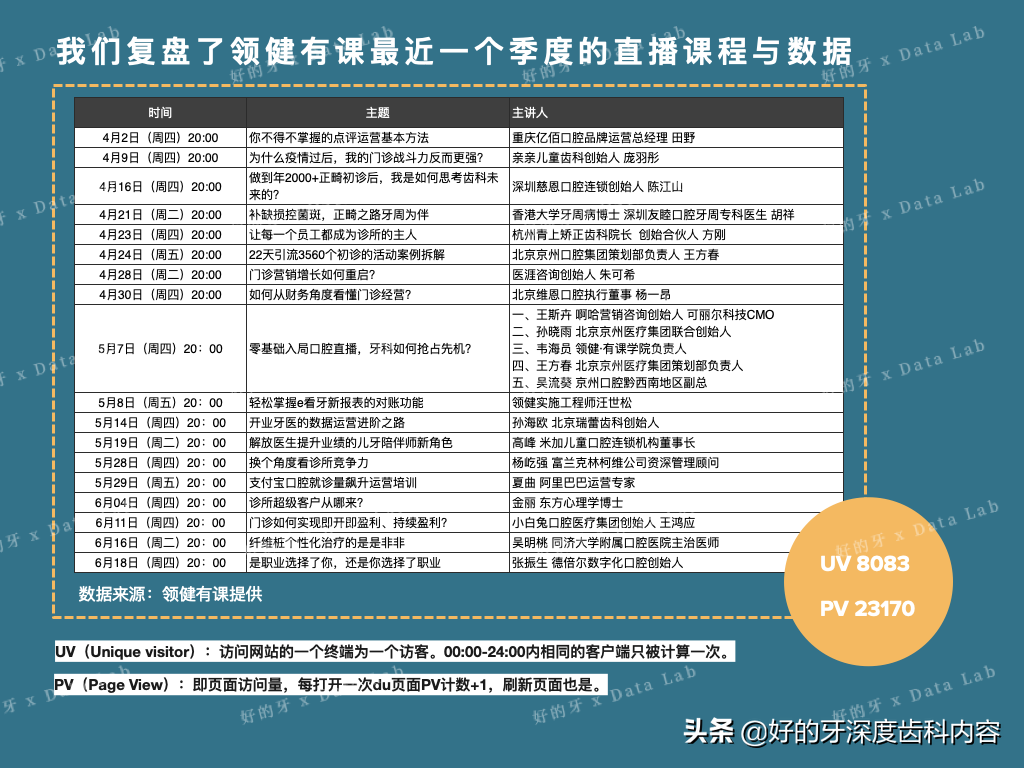 在線專業(yè)性齒科教育平臺(tái),如“領(lǐng)健有課”也乘勢(shì)而上,不斷優(yōu)化課程內(nèi)容、審核機(jī)制,以及進(jìn)行高頻直播操練。