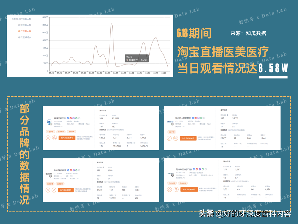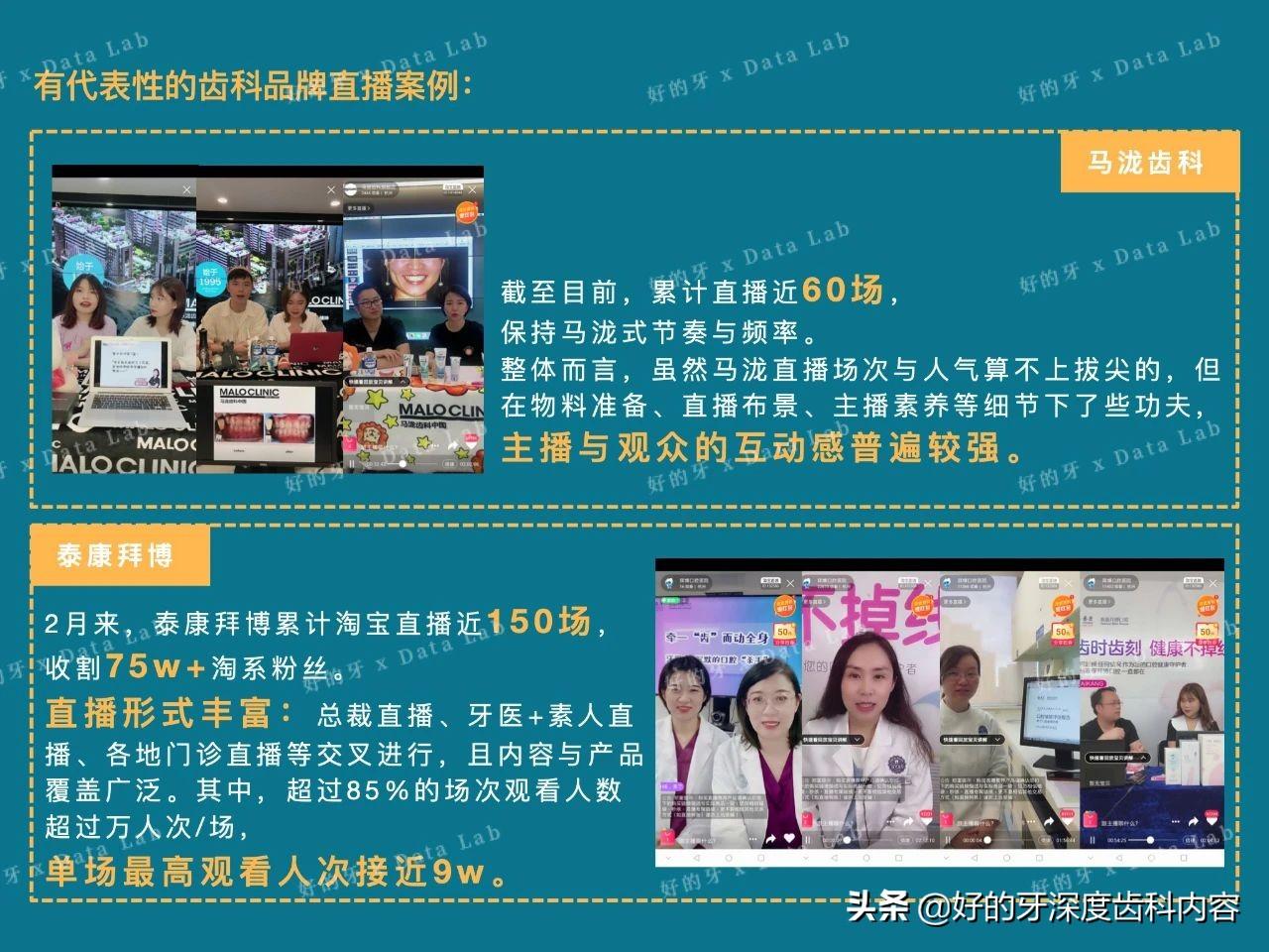 毫不夸張的說,在線面診、牙醫(yī)直播科普、直播上網(wǎng)課幾乎成為眾多齒科品牌的標(biāo)配,與此同時(shí),不少頭部品牌開始試水直播帶貨,以各自的天貓店鋪為陣地,借助淘寶直播帶貨。6月里,泰康拜博聯(lián)手劉濤帶貨種植牙,首度將“齒科品牌+明星直播+直播平臺(tái)”三者鏈為一體,似乎也給行業(yè)打開了新的銷售路徑。