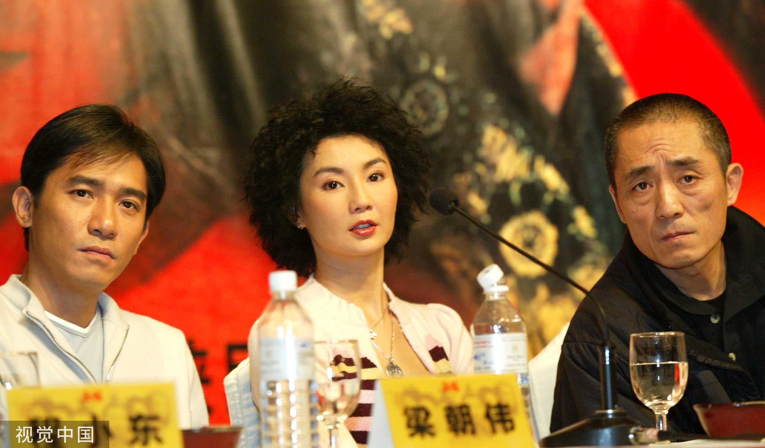 2002年12月16日,梁朝偉、張曼玉、張藝謀出席電影《英雄》上海發(fā)布會。視覺中國 圖