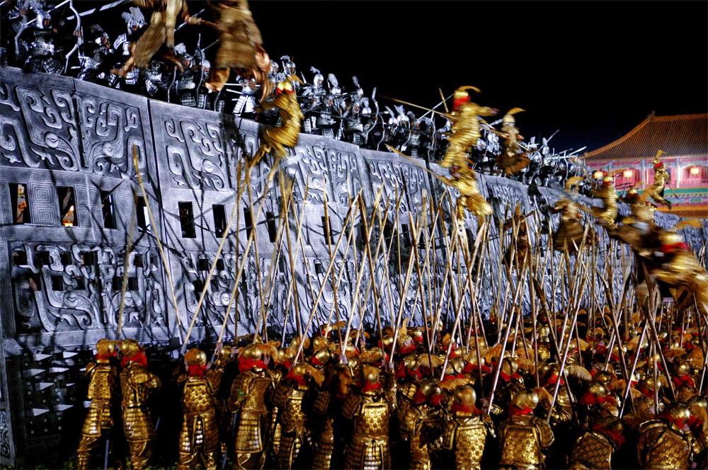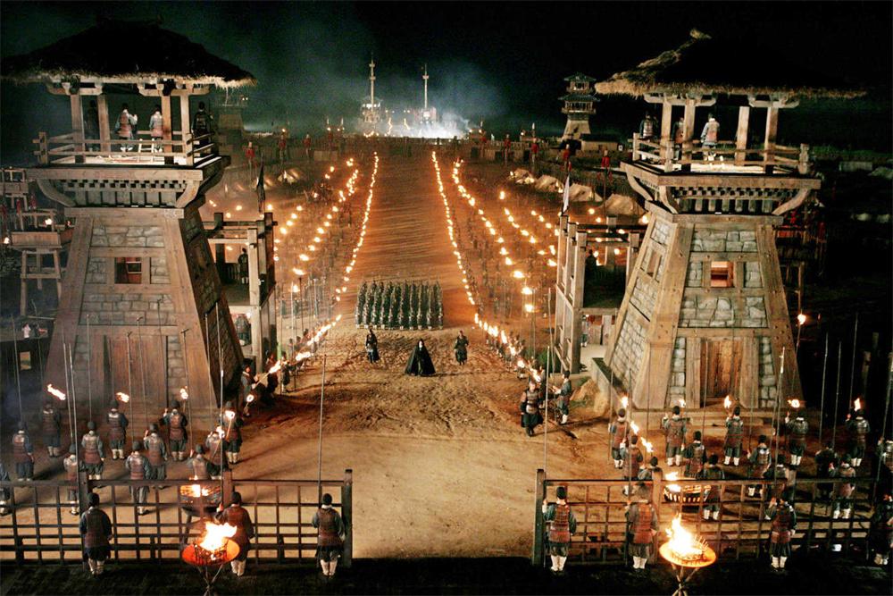 《滿城盡帶黃金甲》中,核心場景的宮殿取景于橫店,拍攝時有近3000個工人在加班加點布景,為了符合影片唐朝背景的拍攝需要,張藝謀要求筑起高達5米的圍墻,又在萬余平方米面積的廣場里,全部鋪上黃花,數(shù)量高達400萬朵。多的一場戲,想要出動兩萬名群演,其中包括大量部隊官兵。