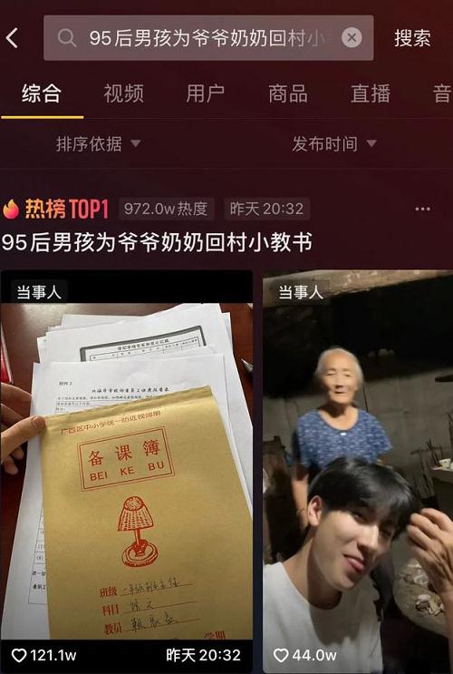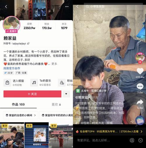 8月30日,秋季開學(xué)的第一天,抖音上的鄉(xiāng)村小學(xué)教師賴家益被網(wǎng)友們送上了抖音熱榜第一。作為一名在抖音擁有180多萬粉絲關(guān)注的視頻作者,賴家益曾因?yàn)?0多歲的爺爺奶奶補(bǔ)拍婚紗照被網(wǎng)友們熟知。畢業(yè)后,他選擇在大學(xué)畢業(yè)后回到家鄉(xiāng)的小山村里,成為鄉(xiāng)村小學(xué)教師。