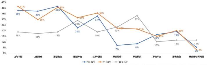 18-40的人群組中,牙周疾病與牙齒缺失的現(xiàn)象相比其他兩個(gè)年齡組占比較低,“口氣不好”、“口腔潰瘍”、“牙齦出血”等口腔問題較為,“牙齦腫痛”、“牙齒敏感”、“牙齒松動(dòng)”與“牙齒缺失”的現(xiàn)象在40歲后的人群中占比逐漸上升。