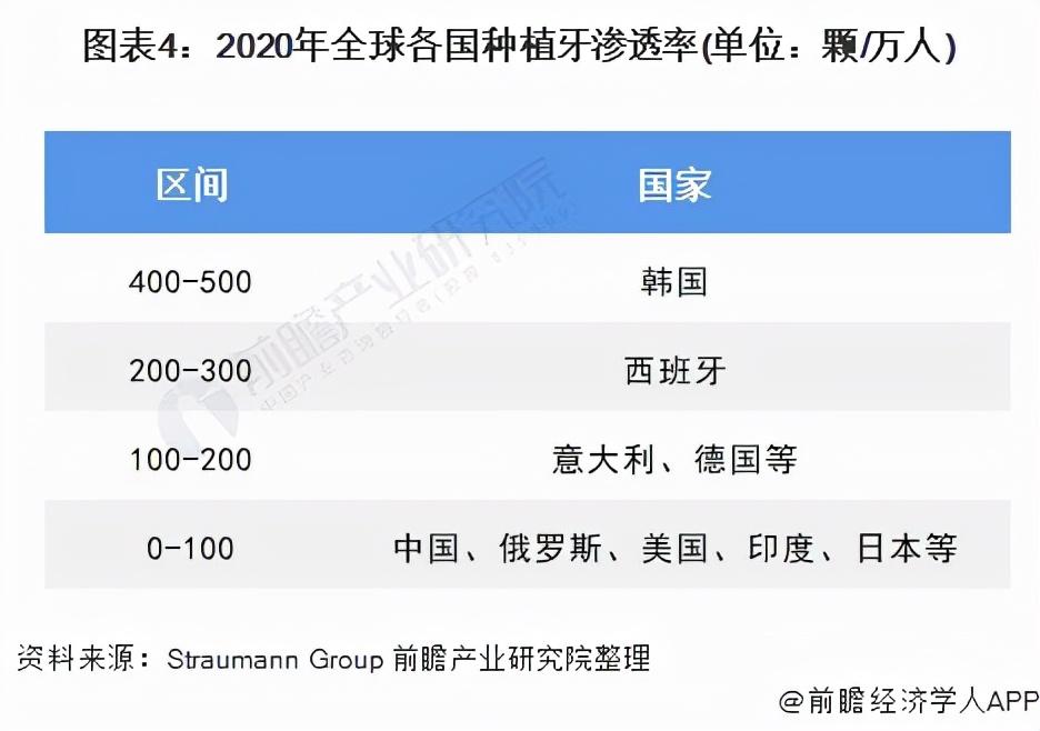 近年來我國種植牙市場(chǎng)迎來高速增長,2011年我國種植牙數(shù)量僅有13萬顆,2020年我國種植牙數(shù)量已達(dá)到約406萬顆,處于滲透率快速提升的階段。但相較于韓國、西班牙等,我國種植牙滲透率仍然處于低位,2020年我國種植牙滲透率約29顆/萬人(種植牙數(shù)量/人口總數(shù)),而韓國的種植牙滲透率已經(jīng)接近500顆/萬人,我國種植牙市場(chǎng)還有較大發(fā)展空間。
