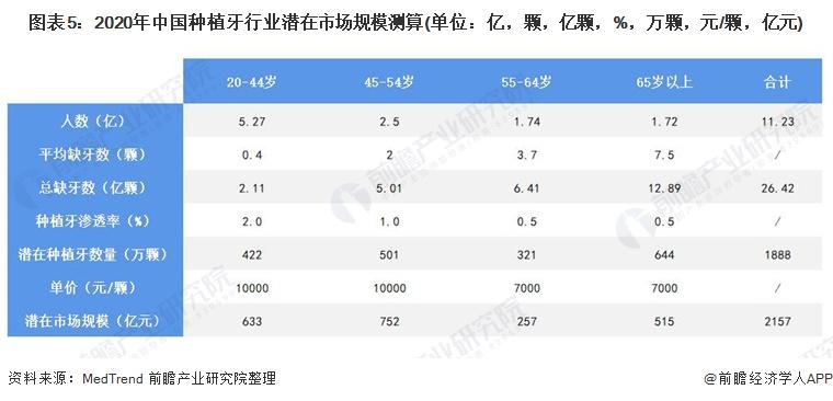 根據(jù)《2020中國口腔醫(yī)療行業(yè)報(bào)告》數(shù)據(jù)測(cè)算,目前我國人口總?cè)毖罃?shù)達(dá)到26.42億顆,潛在種植牙數(shù)量1888萬顆,潛在種植牙市場(chǎng)規(guī)模超過2000億元。