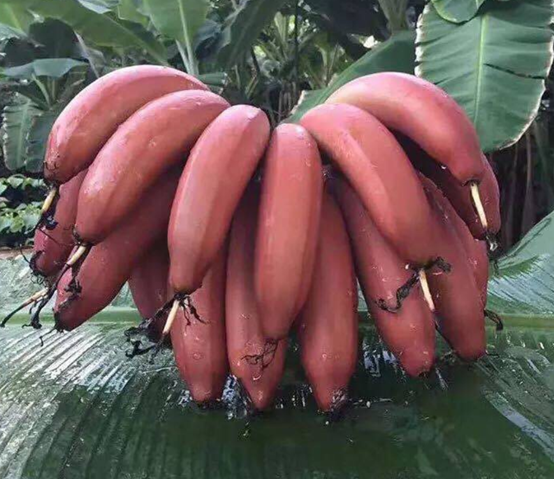 5、 紅香蕉 又稱(chēng)紅皮香蕉、紅紫香蕉,紅色達(dá)卡等。原產(chǎn)馬來(lái)西亞,為廣東省農(nóng)科院果樹(shù)所引進(jìn)。植株高3.70~4.50米,假莖粗;每穗果梳數(shù)為5~7梳,每梳果指13~16條左右,果指長(zhǎng)16~20厘米,平均單果重300克。果皮自開(kāi)始結(jié)果到成熟從暗紫紅色轉(zhuǎn)為紅色,果肉為淺黃色,肉質(zhì)細(xì)膩且有獨(dú)特香味,糖分含量低。紅香蕉果皮臘質(zhì)厚、耐貯運(yùn),適合遠(yuǎn)距離運(yùn)輸。