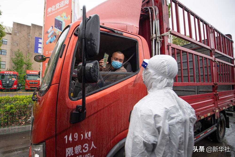 4月13日,工作人員查驗(yàn)駛?cè)牒贾輦骰犯鄣呢涇囁緳C(jī)健康碼。新華社記者 江漢 攝