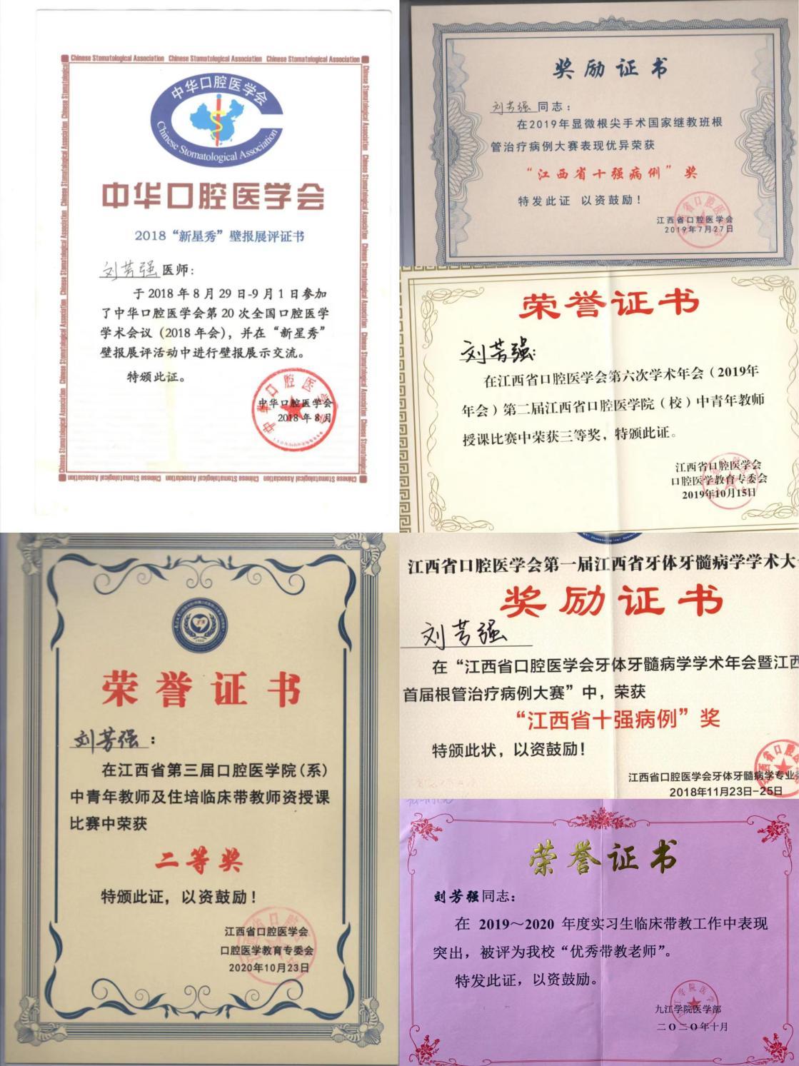 劉芳強于2018-2021年連續(xù)四年分別在中華口腔醫(yī)學會、全國DMG第三季滲透樹脂病例大賽、江西省口腔醫(yī)學院校中青年教師授課比賽、九江市市級繼教項目以及九江學院醫(yī)學部實習生臨床帶教工作中等榮獲多項獎項。取得優(yōu)異成績的背后,是他及團隊默默地付出及堅持。