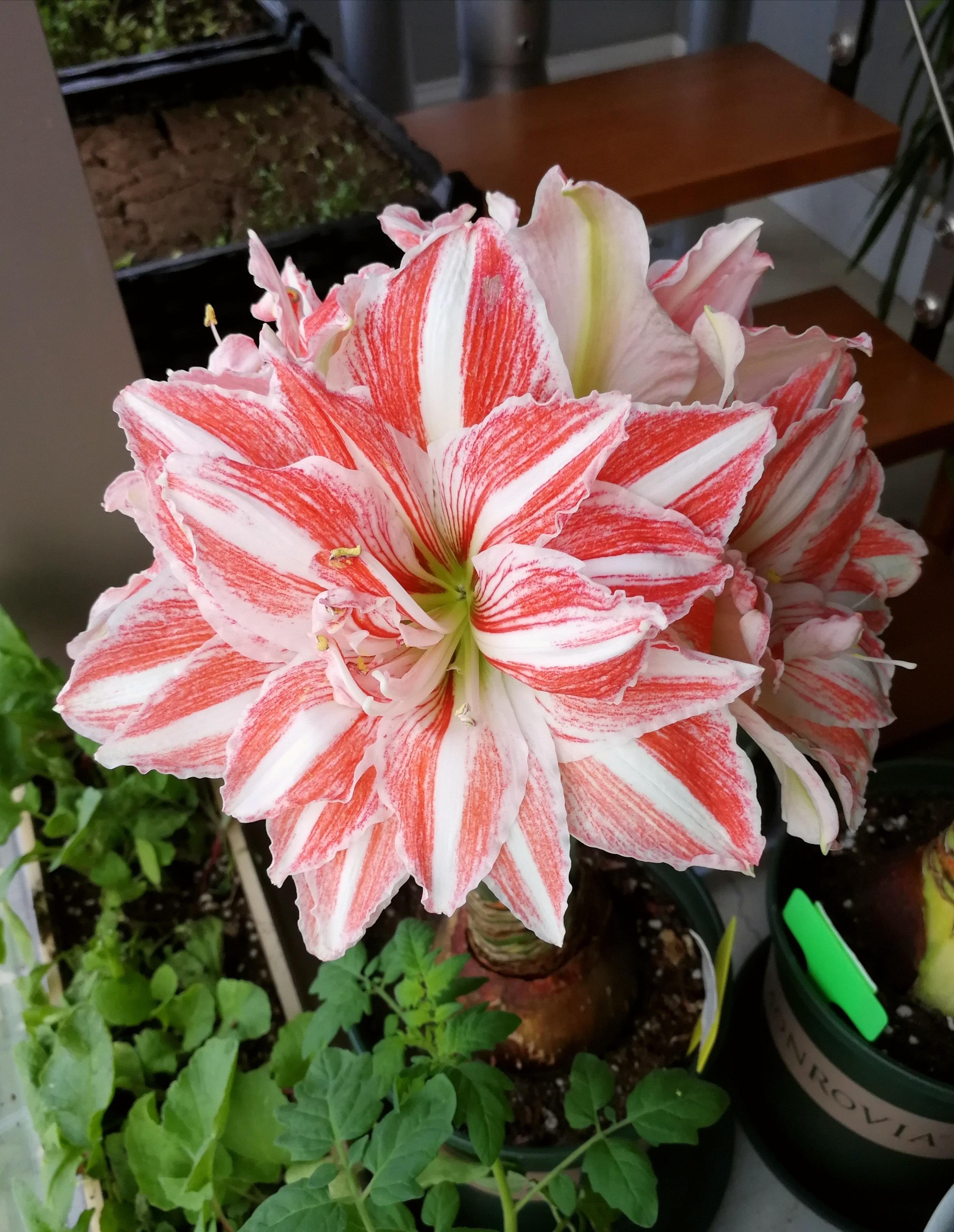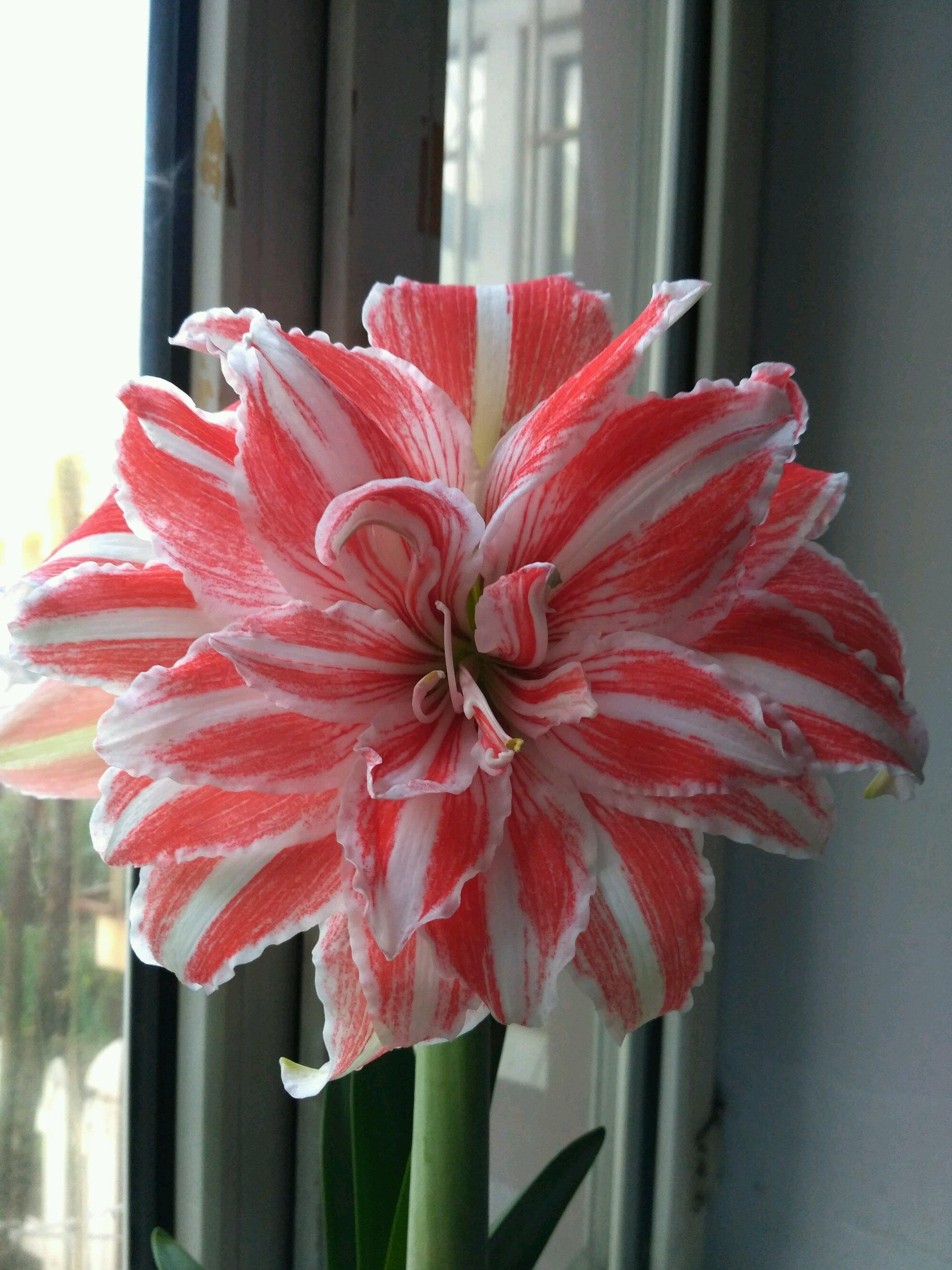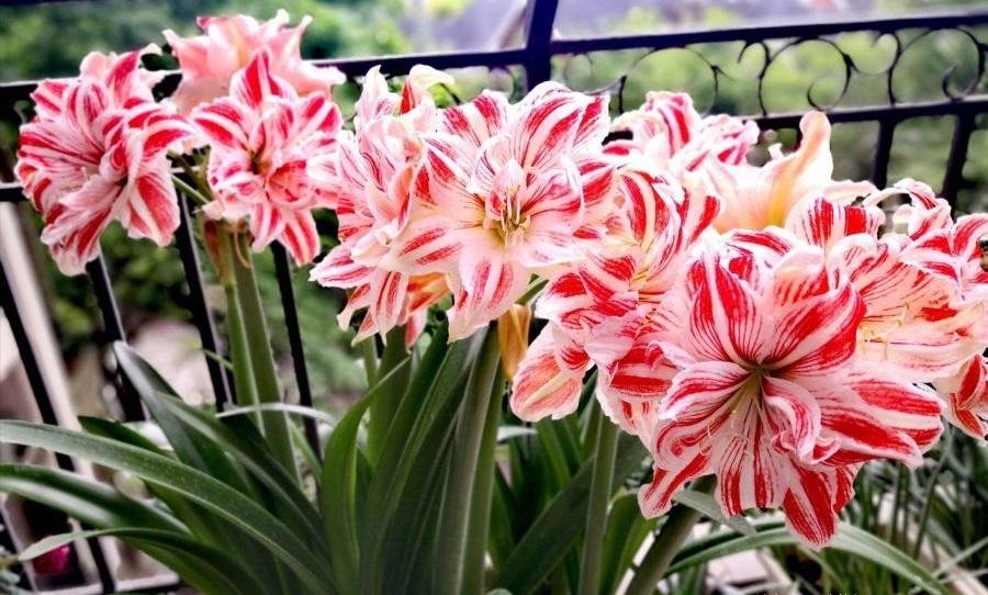 舞后的葉子是綠油油的,表面光滑翠綠,像抹了油一般亮晶晶,生機勃勃,在沒有開花的時候能當(dāng)觀葉植物欣賞,不過還是以觀花為主——花桿從鱗莖處高高抽出,比葉子高處許多,頂部著花2~8朵,朝著四個方向開放,花型重瓣,大中型花,直徑能達到25cm,花型和大麗花有點像,花姿優(yōu)雅美麗,有磅礴威武之勢,花色為白色,并帶紅色的條紋,在陽光的照耀下,格外亮麗,閃亮亮的,很是吸引人眼球,有著很高的觀賞價值。