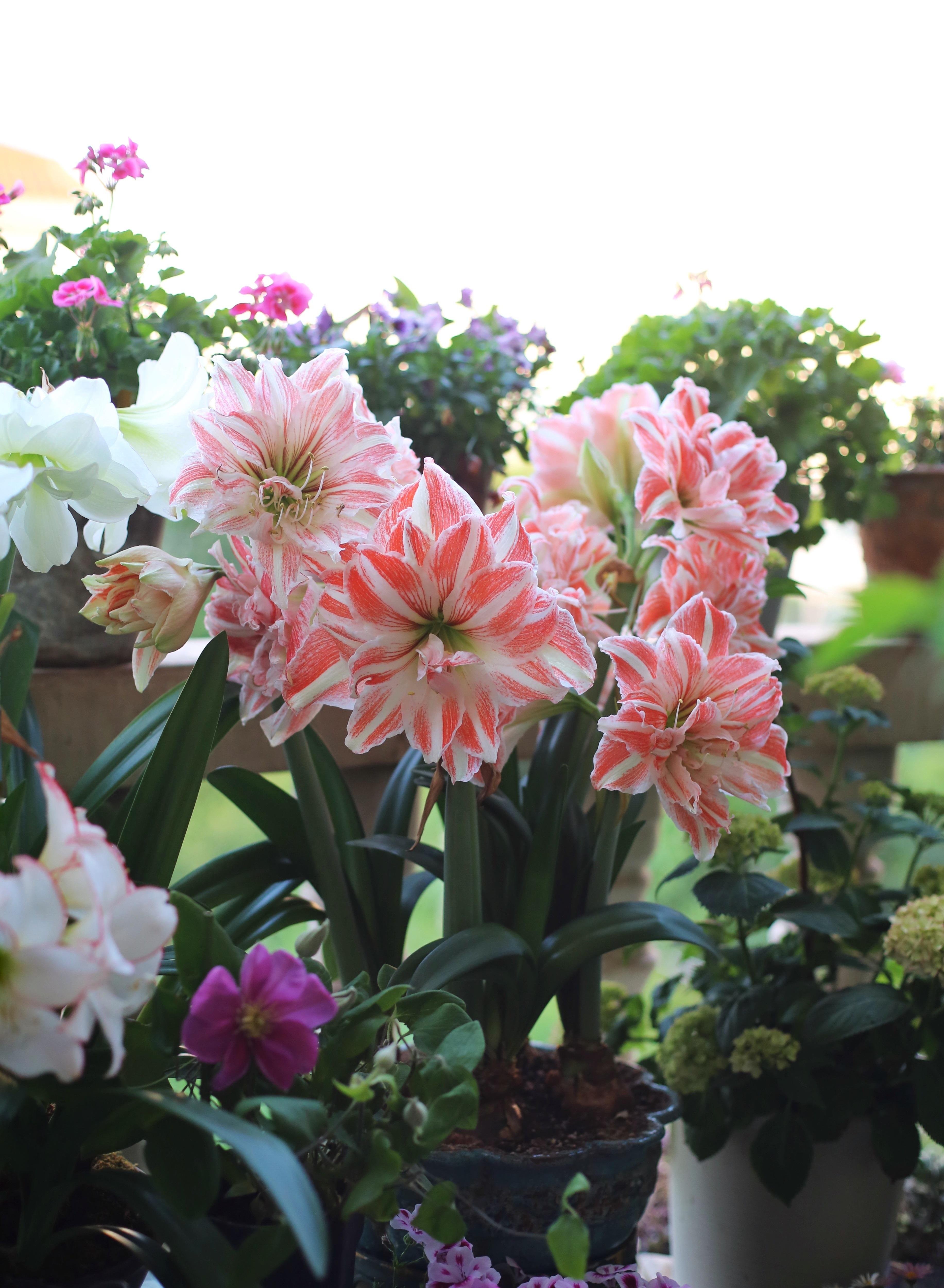 很多人以為朱頂紅一年只有春天一季開花,其實“土朱”才是這樣,很多新培育的洋朱是具有多季節(jié)重復(fù)開花的特性,比如阿弗雷、精靈,還有今天的舞后,在春夏秋三季都能開花,養(yǎng)護得當(dāng),一年能開花好幾次,而且花量豐富,一桿能同時開好幾朵花,球體越大,花劍越多,常常是多箭齊發(fā)。以“舞后”為例,球體直徑大于4cm就會開花,多能同時開花二三十朵!