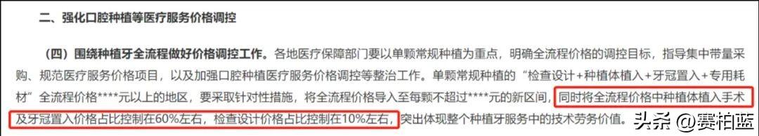 《通知》中明確提出,要將全流程價(jià)格中種植體植入手術(shù)及牙冠置入價(jià)格占比控制在60%左右,檢查設(shè)計(jì)價(jià)格占比控制在10%左右。
