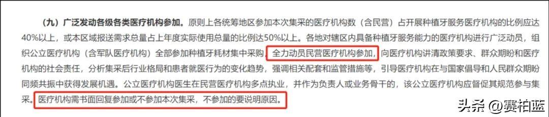 為了推進(jìn)種植牙集采落地,新《通知》中明確提出,要求各地對(duì)轄區(qū)內(nèi)具備種植牙服務(wù)能力的醫(yī)療機(jī)構(gòu)進(jìn)行廣泛動(dòng)員,組織公立醫(yī)療機(jī)構(gòu)全部參加種植牙耗材集中采購(gòu),全力動(dòng)員民營(yíng)醫(yī)療機(jī)構(gòu)參加。醫(yī)療機(jī)構(gòu)需書面回復(fù)參加或不參加本次集采,不參加的要說明原因。