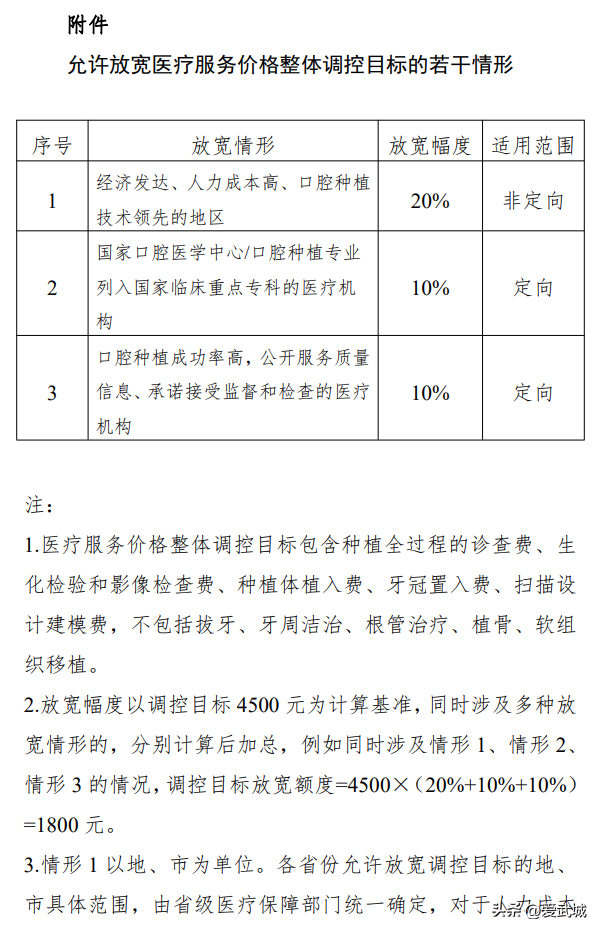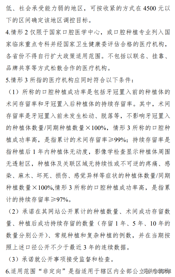 (四)圍繞種植牙全流程做好價(jià)格調(diào)控工作。各級(jí)醫(yī)療保障部門要以單顆常規(guī)種植牙的醫(yī)療服務(wù)價(jià)格為重點(diǎn),按照“診查檢查+種植體植入+牙冠置入”的醫(yī)療服務(wù)價(jià)格實(shí)施整體調(diào)控(詳見(jiàn)附件),目前三級(jí)公立醫(yī)療機(jī)構(gòu)完成全流程種植,醫(yī)療服務(wù)價(jià)格整體普遍高于4500元每顆的地區(qū),應(yīng)采取針對(duì)性措施,導(dǎo)入至整體不超過(guò)4500元每顆的新區(qū)間,三級(jí)以下公立醫(yī)療機(jī)構(gòu)的調(diào)控目標(biāo)參照當(dāng)?shù)蒯t(yī)療服務(wù)分級(jí)定價(jià)的政策相應(yīng)遞減。鼓勵(lì)有條件的地區(qū)在調(diào)控目標(biāo)范圍內(nèi)進(jìn)一步采取談判協(xié)商、成本監(jiān)審等措施降價(jià),進(jìn)一步擴(kuò)大調(diào)控果惠及群眾。當(dāng)前醫(yī)療服務(wù)價(jià)格整體已普遍低于4500元每顆的地區(qū),鼓勵(lì)維持現(xiàn)行低價(jià)。允許經(jīng)濟(jì)發(fā)達(dá)、人力等成本高的地區(qū)根據(jù)本地實(shí)際放寬醫(yī)療服務(wù)價(jià)格調(diào)控目標(biāo),放寬比例不超過(guò)20%;鼓勵(lì)地方對(duì)于口腔種植高等特定情形的醫(yī)療機(jī)構(gòu),探索定向?qū)捤傻目谇环N植醫(yī)療服務(wù)價(jià)格整體調(diào)控政策(詳見(jiàn)附件)。各省級(jí)醫(yī)療保障部門結(jié)合醫(yī)療服務(wù)價(jià)格整體調(diào)控要求,以及種植體集采、牙冠競(jìng)價(jià)的結(jié)果,合并制定并公開本地區(qū)種植牙全流程價(jià)格調(diào)控目標(biāo)(含種植體、牙冠、醫(yī)療服務(wù)),采取針對(duì)性的落實(shí)舉措。