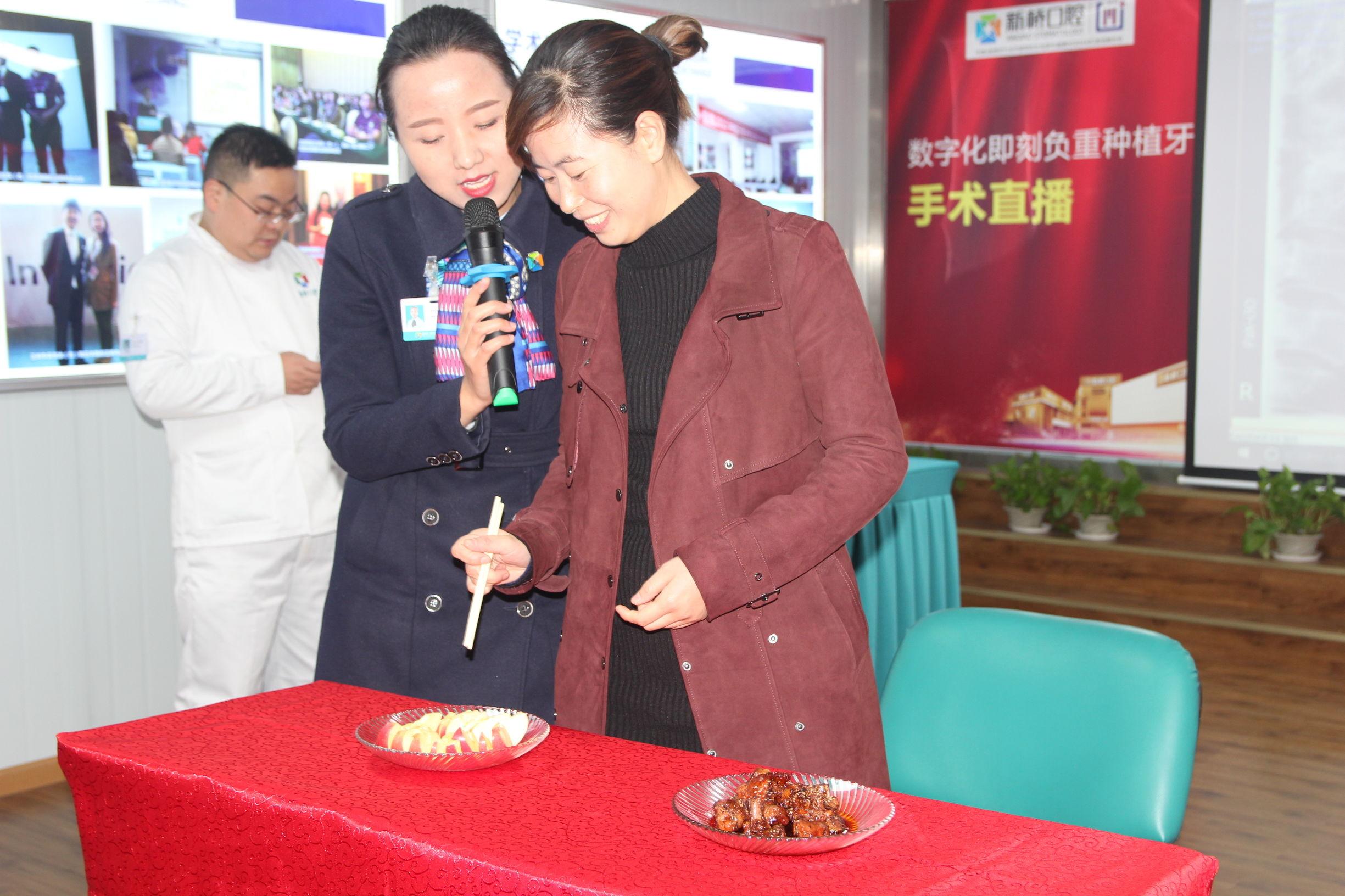在活動(dòng)開(kāi)始前,新橋口腔就“夸下??凇?,稱種完牙可以立刻吃排骨。手術(shù)結(jié)束后,馮女士和王旭東醫(yī)生再次來(lái)到直播現(xiàn)場(chǎng),現(xiàn)場(chǎng)挑戰(zhàn)負(fù)重種植牙的咀嚼力。