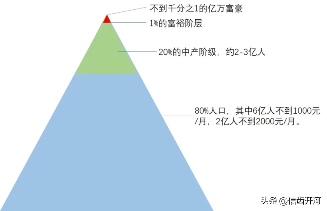 而筆者多次提及中國今天的人口經濟結構是三角形結構。富有的的人群只占整體人口比例不到2%,中產富裕人群占了20%,而剩下的80%人口為月均收入2000元左右的低收入群體。所以中國人口的貧富差距在世界范圍來看也屬于較大的。