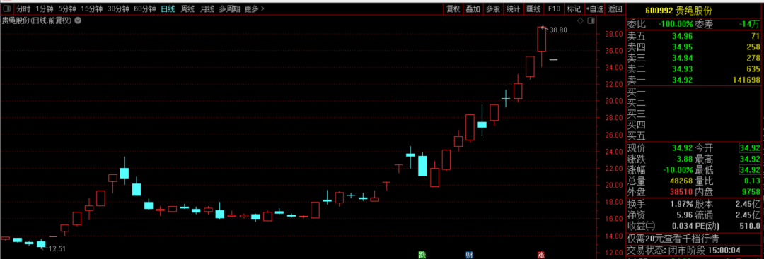 今天,妖股貴繩股份開盤一字跌停了,對(duì)市場(chǎng)人氣影響較大。