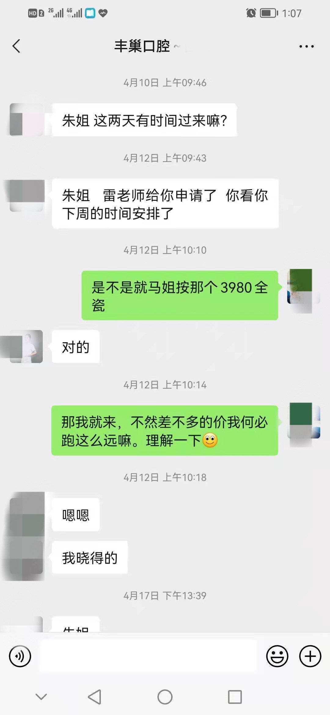 朱女士表示,今年3月,經(jīng)朋友介紹,她前往豐巢口腔門診檢查牙齒。“我的朋友花了3980元種植了兩顆牙齒,于是我也要求醫(yī)院用同樣的價格和材料種植兩顆。”與診所談妥后,朱女士支付了1000元押金并簽署合同。