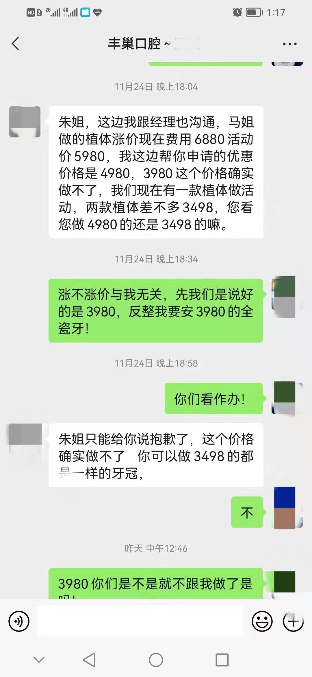 記者聯(lián)系到了診所的工作人員圓圓,圓圓解釋說,朱女士開始交付了1000元的定金,但這1000元已經(jīng)在后續(xù)調(diào)節(jié)中使用了,而當(dāng)時她有告知朱女士多交一部分錢,但朱女士不愿意,因此就沒有為她支付植體定金,如今植體漲價,診所當(dāng)然不會承擔(dān)這筆增加的費用。