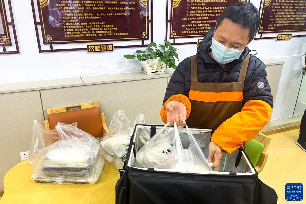 2022年11月3日,吉林省長春市朝陽區(qū)東田社區(qū)助老餐廳的工作人員準(zhǔn)備為社區(qū)居民送餐。新華社記者 趙丹丹 攝
