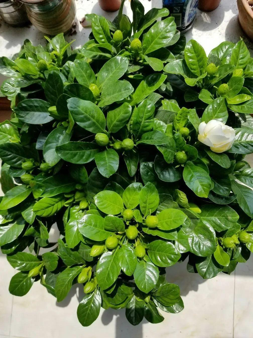 注意,剛買(mǎi)回來(lái)的帶苞梔子花,建議大家不要換盆、換土,就原封不動(dòng)放家里散光通風(fēng)的地方養(yǎng)著,等它開(kāi)花,所有花都開(kāi)完了,我們?cè)倏紤]換盆。否則,買(mǎi)回家就換盆換土洗根,一個(gè)周內(nèi)花苞掉光,再過(guò)2-3個(gè)周,整個(gè)死翹,所以別折騰,越折騰越開(kāi)不了花!