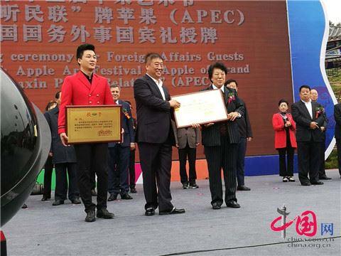 王冀女士為棲霞“華昕民聯(lián)”牌蘋(píng)果(APEC)中國(guó)國(guó)務(wù)外事國(guó)賓禮授牌