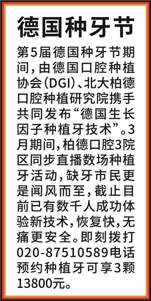 3月,柏德口腔直播德國種植牙技術(shù),不少缺牙市民紛紛來前來咨詢和體驗(yàn)。4月13日,柏德口腔再次舉辦德國種植牙技術(shù)直播,這是第5屆德國種牙節(jié)后兩場直播,缺牙市民可撥打電話報(bào)名參與。4月中旬,柏德口腔將舉辦大型活動,邀請《外來媳婦本地郎》中大佬“阿光”的主演蘇志丹和“蘇貴元”飾演者陳堅(jiān)雄現(xiàn)場分享他們種植牙的過程。想親臨現(xiàn)場的羊城街坊可以撥打電話報(bào)名。