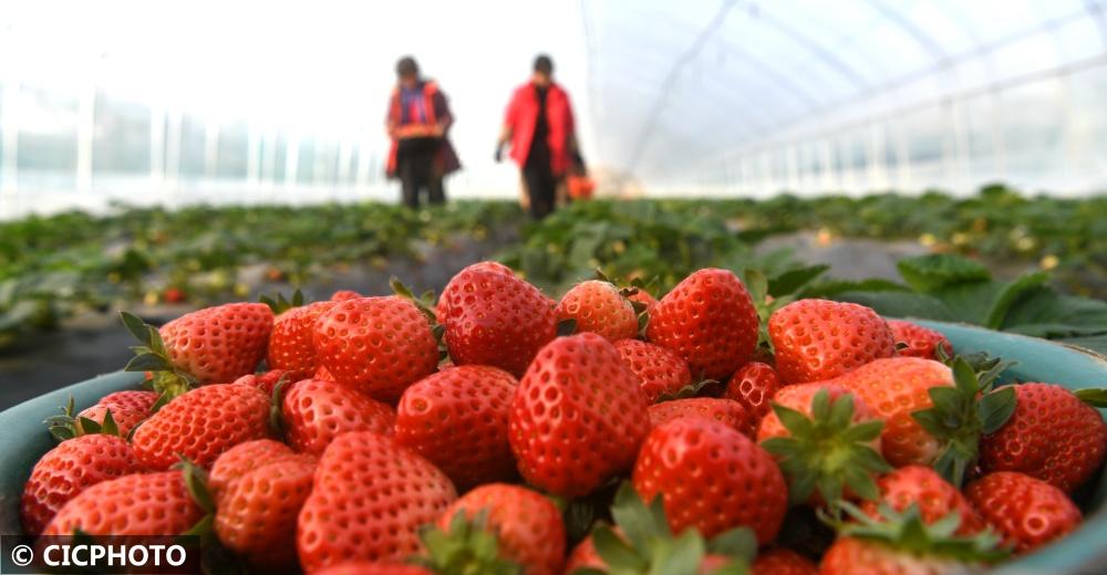 ↑2022年12月7日,山東省聊城市茌平區(qū)樂平鋪鎮(zhèn)小劉新村村民在現(xiàn)代農(nóng)業(yè)產(chǎn)業(yè)示范園內(nèi)采摘草莓。CICPHOTO/馬紅坤 攝