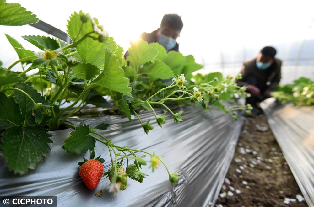 ↑2022年12月7日,河北省邯鄲市叢臺(tái)區(qū)黃粱夢(mèng)鎮(zhèn)貴龍崗村村民在大棚內(nèi)管護(hù)草莓。CICPHOTO/郝群英 攝
