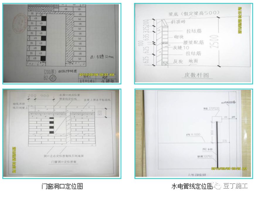 為減少施工中現(xiàn)場切鋸工作量,避免材料浪費(fèi),砌筑前應(yīng)進(jìn)行砌塊排列設(shè)計(jì),繪制砌體排磚 圖、皮數(shù)桿圖,將反坎、拉結(jié)筋 、腰梁 、頂磚等位置表達(dá)清楚。