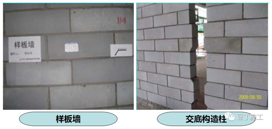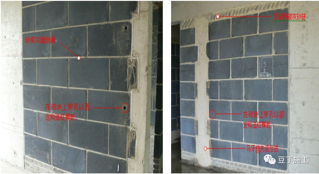 班組進(jìn)場后,前要砌筑樣板,樣板砌體滿足要求后方可大面施工。長度超過 5 米、寬度超過 2.4m 的洞口兩側(cè)以及長度超過 2.5m 獨(dú)立墻體端部的砌體應(yīng)按要求留設(shè)構(gòu)造柱,墻與構(gòu)造柱連接預(yù)留馬 牙槎,水平筋錨入柱內(nèi)。