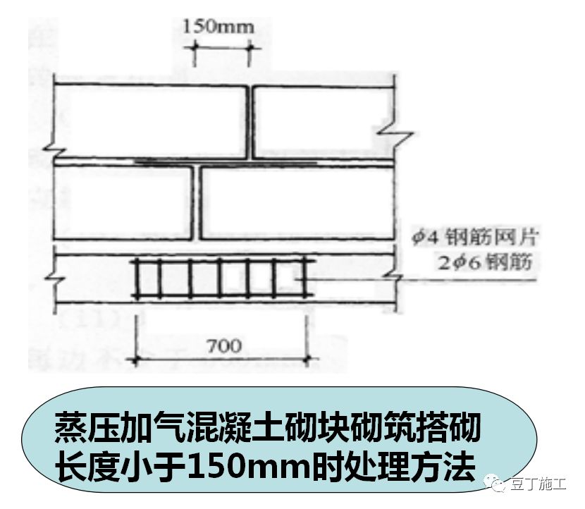 砌筑時(shí)應(yīng)預(yù)先試排砌塊,并優(yōu)先使用整體砌塊。不得已須斷開砌塊時(shí),應(yīng)使用手鋸、切割機(jī)等工具鋸裁整齊,并保護(hù)好砌塊的棱角,鋸裁砌塊的長度不應(yīng)小于砌塊總長度的1/3。長度小于等于150mm的砌塊不得上墻。砌筑底層砌塊時(shí),當(dāng)灰縫厚度大于20mm時(shí)應(yīng)使用細(xì)石混凝土鋪密實(shí),上下皮灰縫應(yīng)錯(cuò)開搭砌,搭砌長度不應(yīng)小于砌塊總長的1/3。當(dāng)搭砌長度小于150mm時(shí),即形成通縫,豎向通縫不應(yīng)大于2皮砌塊,否則應(yīng)配A4鋼筋網(wǎng)片或2A6.5鋼筋,長度宜為700mm,詳見下圖。