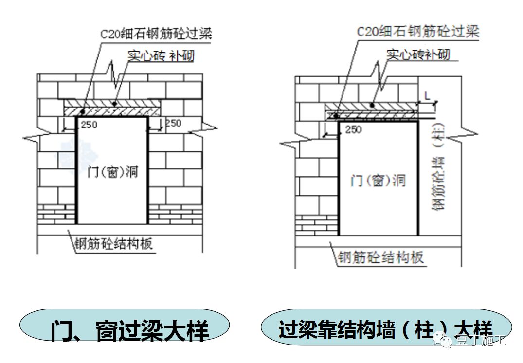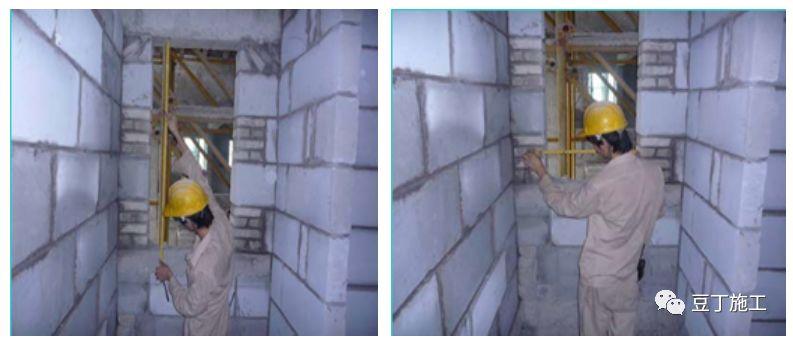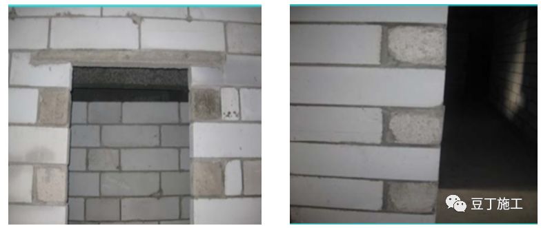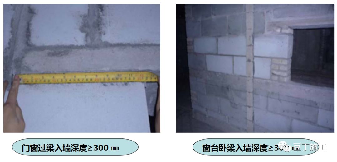 門窗洞口兩側(cè)按要求埋設(shè)水泥預(yù)制塊;洞口預(yù)制過梁兩端應(yīng)伸入砌體≥300mm。