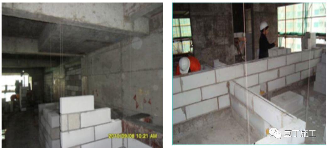不同干密度和強(qiáng)度等級的加氣混凝土不應(yīng)混砌。加氣混凝土砌塊也不得與其它磚、砌塊混砌。但在墻底、墻頂及門窗洞口處局部采用燒結(jié)普通磚和多孔磚砌筑不視為混砌。