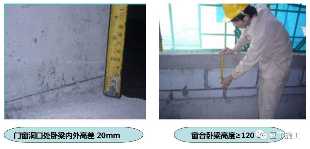 另外,斜磚高度控制在 16-20cm;二次構(gòu)件的窗臥梁高≥ 120mm ,入墻深度≥ 300mm ,窗洞口處內(nèi)外高差 20mm;門窗過梁入墻深度≥ 300mm 。