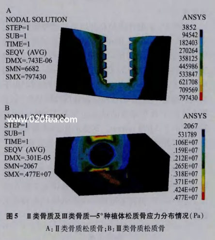 在Ⅱ類骨質中,松質骨的大應力分布于種植體的底部(下方的螺紋處),而在Ⅲ、V類骨質中種植體周圍松質骨應力分布較均勻,但在密質骨與松質骨交界處出現(xiàn)了應力較集中的區(qū)域。同一骨質不同角度的種植體松質骨應力分布情況基本相同。見圖5。